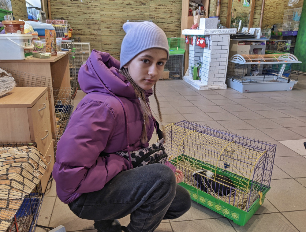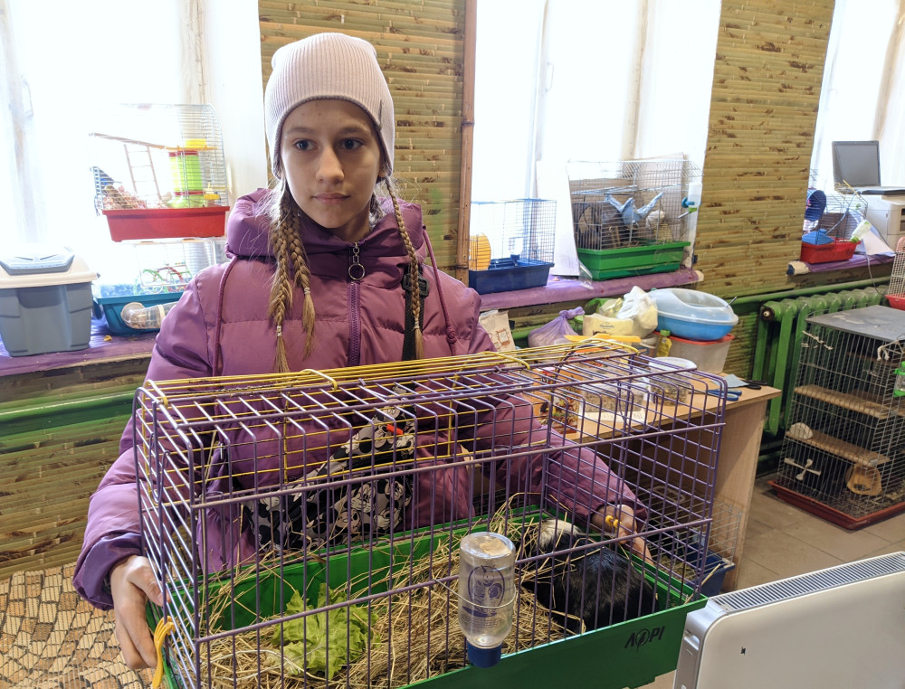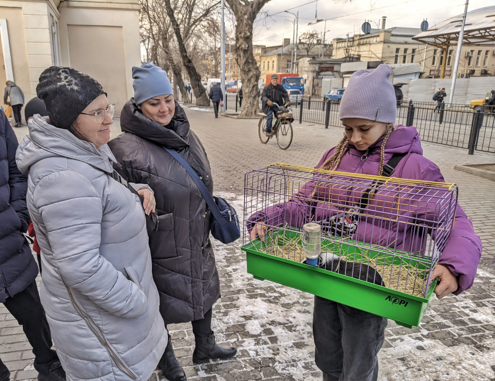 Юная одесситка Аня пришла вместе с мамой Ирой, чтобы взять на передержку морскую свинку. Опыт у Ани есть, она уже ухаживает за своими питомцами, им теперь будет веселее. Выбрали черного красавчика с белыми прядями, осталось только придумать имя. Красавчик копошится в своей клетке, а лица у Ани и Иры светятся от счастья.