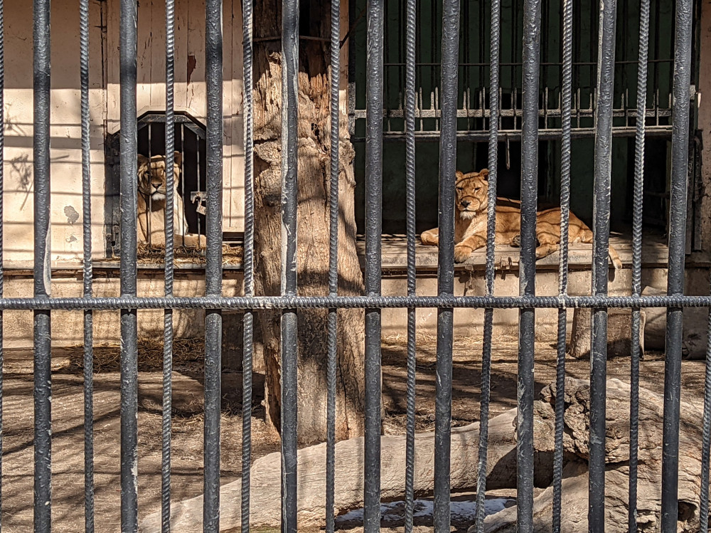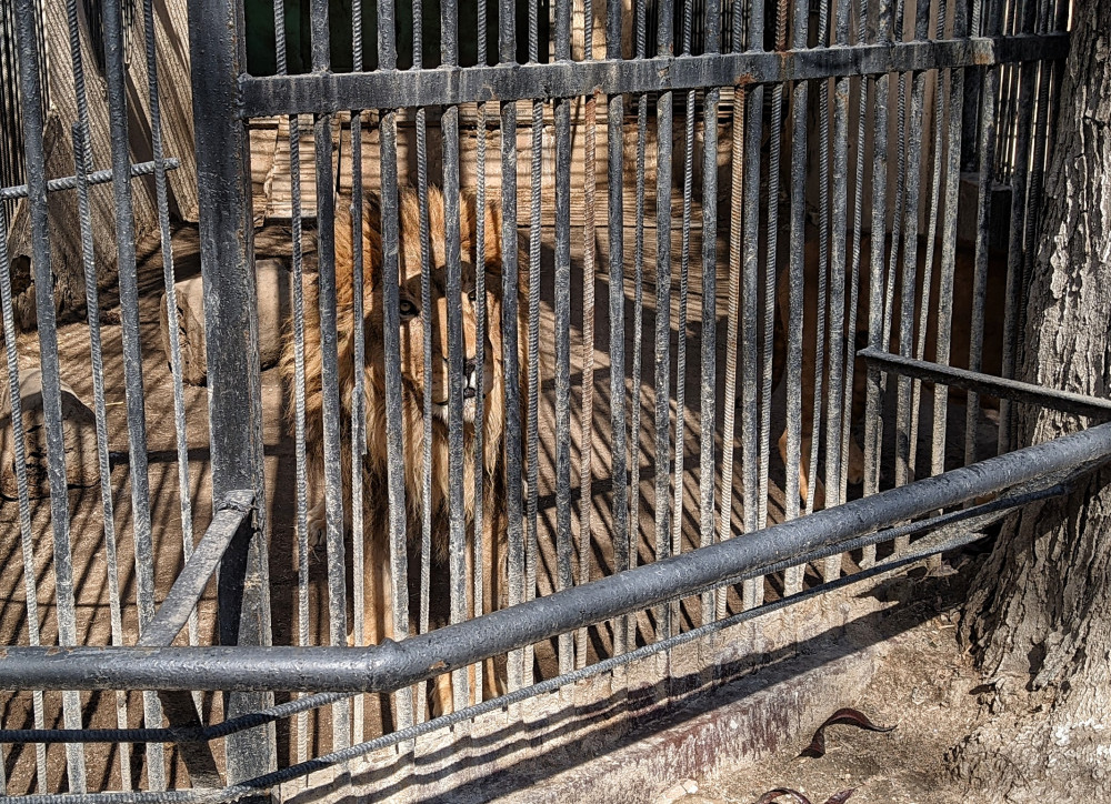 В зоопарке жизнь идет своим чередом, сотрудники деловито развозят корм и чистят клетки. Рыжий конь Мишка, запряженный в повозку с тазами, лопатами и вилами, флегматично вглядывается в потрескавшийся асфальт. Не хватает только посетителей.