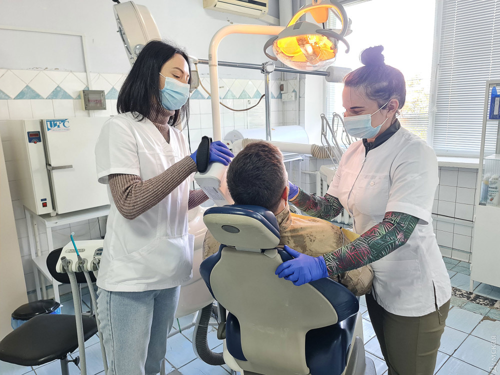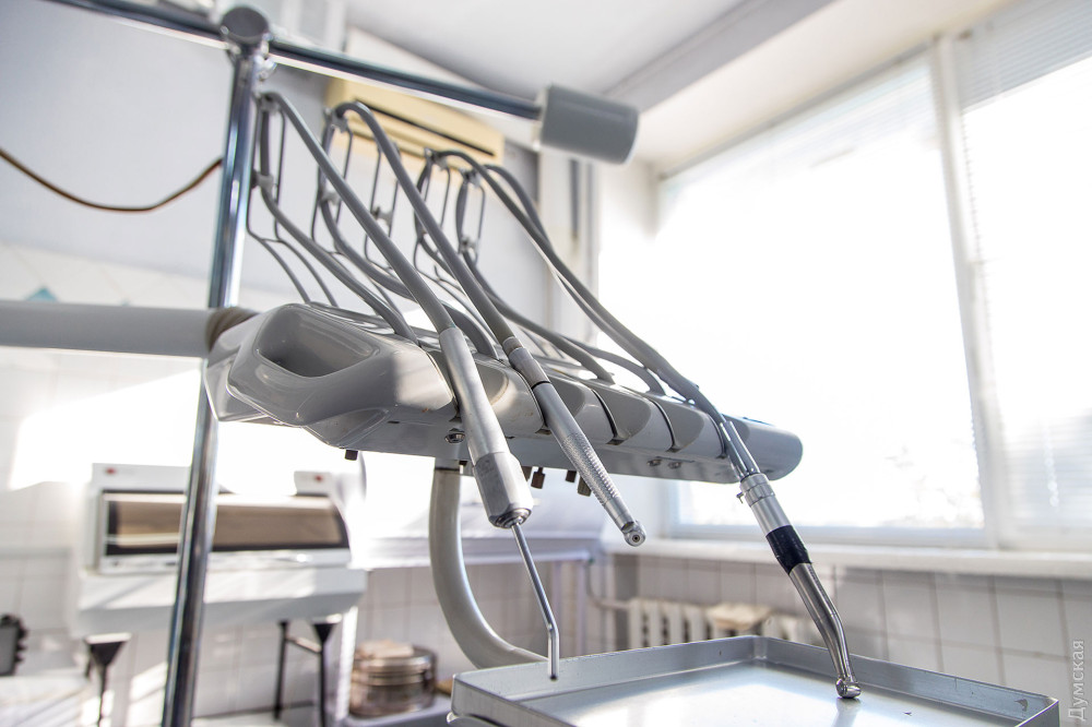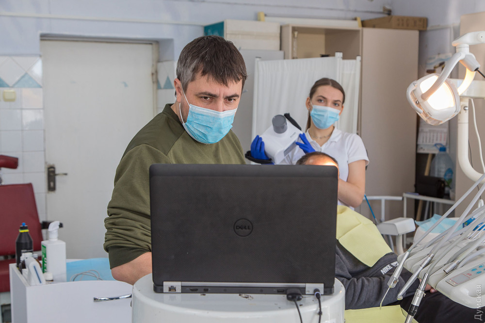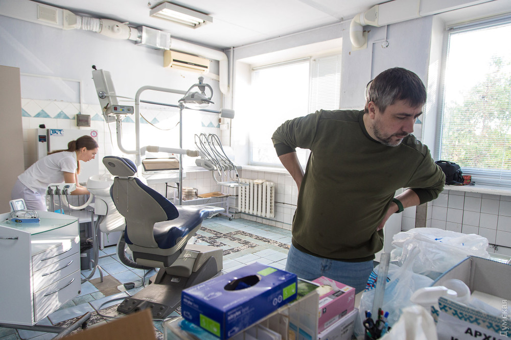 Час у дорозі минув непомітно, і ми вже в стоматологічному кабінеті. Там нас зустрічає Олег. Так волонтери жартують. Олег – це муляж людського черепа, покликаний наочно продемонструвати пацієнтові, як влаштована його щелепа. Кабінет – не першої свіжості, із досить застарілим обладнанням, яке вже з десяток років не зустрінеш у приватних клініках Одеси. Сергій жартує: «Найсучасніше в ньому – це ми».