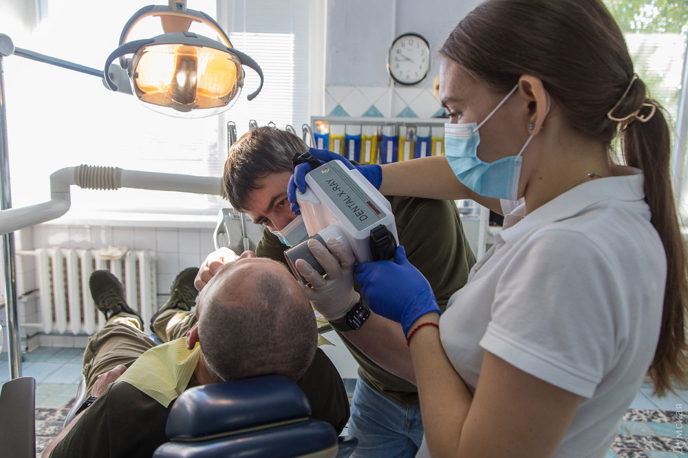 Поки я спілкувався з військовослужбовцями, Сергій та Олена встигли підготувати все необхідне для прийому пацієнтів. На медичних столиках блищить безліч інструментів: бори, шприци, кюретки (хірургічні ложки), затискачі, елеватори тощо. Кожен прилад стерилізований і запаяний в герметичну упаковку. На величезній кварцовій лампі, вмонтованій у підлогу кабінету, тепер встановлений ноутбук, поряд – мобільний рентген-апарат розміром із професійну фотокамеру. У радянському кабінеті ця апаратура виглядає чужорідно.