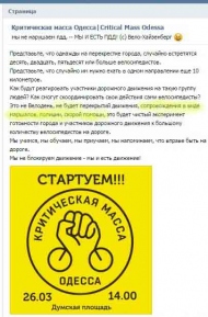 Также призываю к общему сбору всех, кому не безразлична судьба движения «Критическая Масса» в Одессе, для определения дальнейшего вектора развития этого движения.