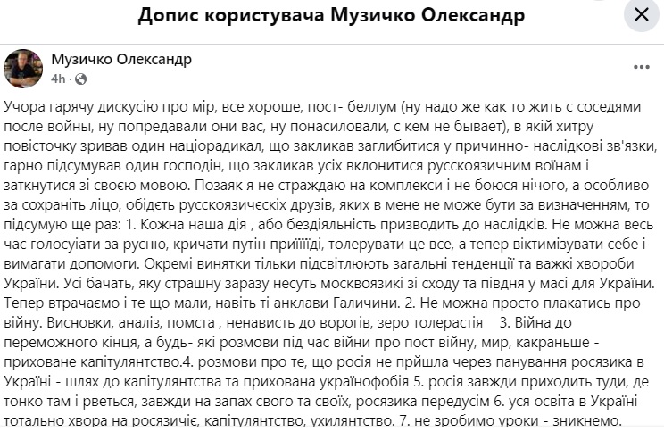 «Усі бачать, яку страшну заразу несуть москвоязикі зі сходу та півдня у масі для України». [sic] https://www.facebook.com/permalink.php?story_fbid=pfbid035B8sTi3F6Hf2DsaDtiVqFn4e3jThgeAKn9iEsXoGmgcHqsjUdPJ4W7VDBrxzKu2gl&id=61553518585370 - Олександр Музычко написал в Фейсбуке объяснительную, за которую впору и под суд, даже если бы он ничего подобного не писал постоянно раньше.