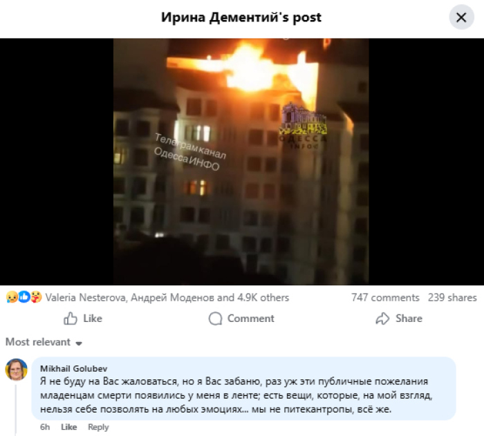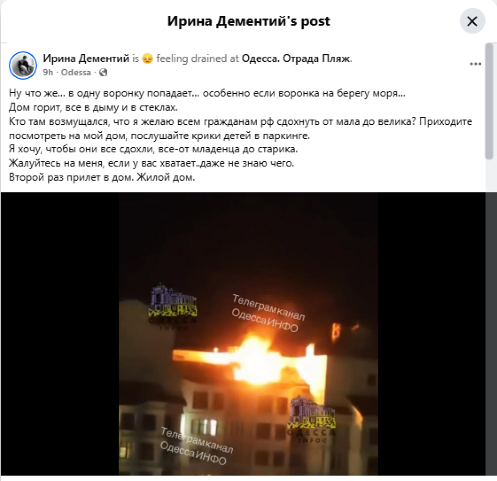 Думаю, что мириться со смертями детей (беременных женщин, … нужное добавить) на стороне противника в результате наших действий — это моральный компромисс, без которого нельзя вести войну, но всё равно более или менее тяжелый уже и так. Однако, публичные пожелания смерти младенцам — не то, до чего вот лично конкретно персонально я хотел бы дойти при любых обстоятельствах. До сегодняшнего дня не имел понятия, что в Одессе столько аналогов Красовского (в плохом смысле слова «Красовский»). Наверное, не с теми общаюсь? Понимаю, почему люди такое пишут. Эмоционально, патриотично… но ещё не значит, что приемлемо. Если за столько часов не удалено авторкой и набрало комментариев в поддержку (хотя там высказывают всякое, от и до) — значит, есть украинцы, которые осознанно желают смерти российским младенцам. Что, в свою очередь, имеет ряд последствий. В качестве одного из них, акцентирую внимание на том, что НЕ все украинцы желают смерти российским младенцам. Ну, пускай меня особо *пламенные* и *неравнодушные* ненавидят ещё и за это, на здоровье; мне уже мало что терять в этом отношении. Если считаю что-то общественно важным и вместе с тем недостаточно проговариваемым, то, с большой вероятностью, говорю — если считаю тему такой, о которой вообще готов судить. Перед началом войны (2014) я прожил уже достаточно долго, чтобы прекрасно понимать, что ничто так не меняет сознание, как кровь, и что «мы становимся похожи на наших врагов». И знал, чего можно ожидать от путина. Что он способен убить и миллион. Поэтому, наверное, моё сознание, будучи ко многому готовым, поменялось не так критично, а в основных вопросах — не поменялось вообще. Но это — моё дело и моя жизнь, а ваше сознание и высказывания — ваше дело, и ваша жизнь. Так что будьте кем хотите, но это — всегда выбор, и не нужно говорить, что нет. |