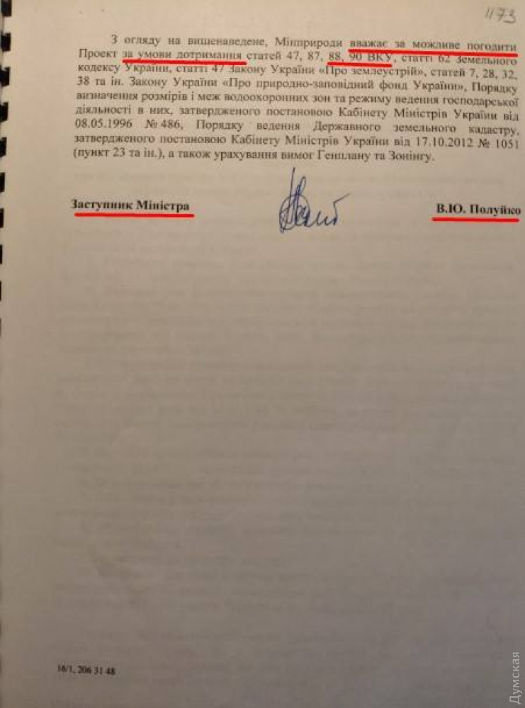 Основным распорядителем земель водного фонда, в том числе и прибрежной защитной полосы с пляжной зоной, является Министерство экологии и природных ресурсов. Именно поэтому их заключение заинтересовало нас в первую очередь. И что же мы увидели? Человек, назвавший себя заместителем министра Полуйко В.Ю. и подписавший заключение, не только «считает возможным» такое разворовывание, но и демонстрирует редкий правовой нигилизм – не только проект нарушает законодательство, его нарушает сам текст «заключения».